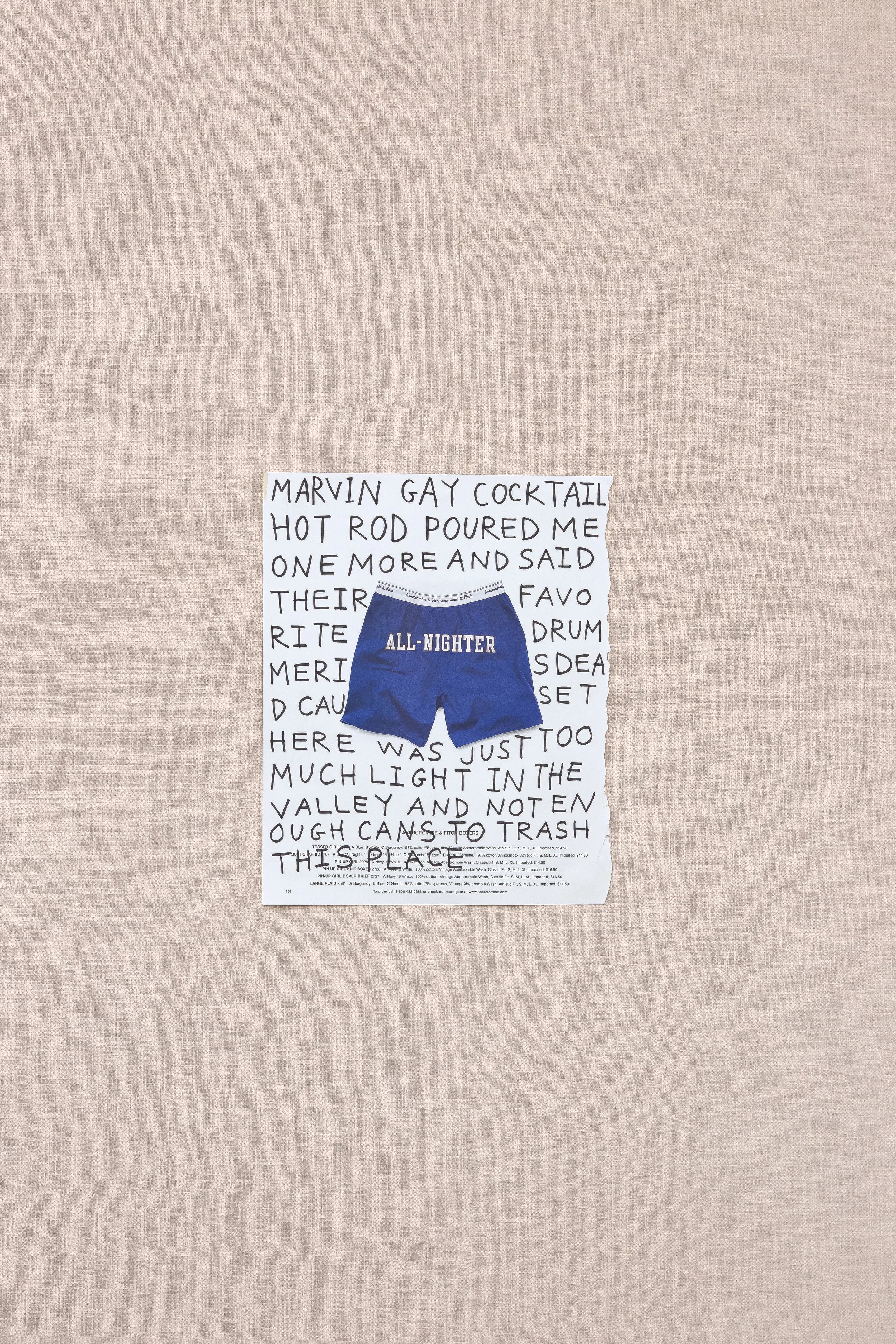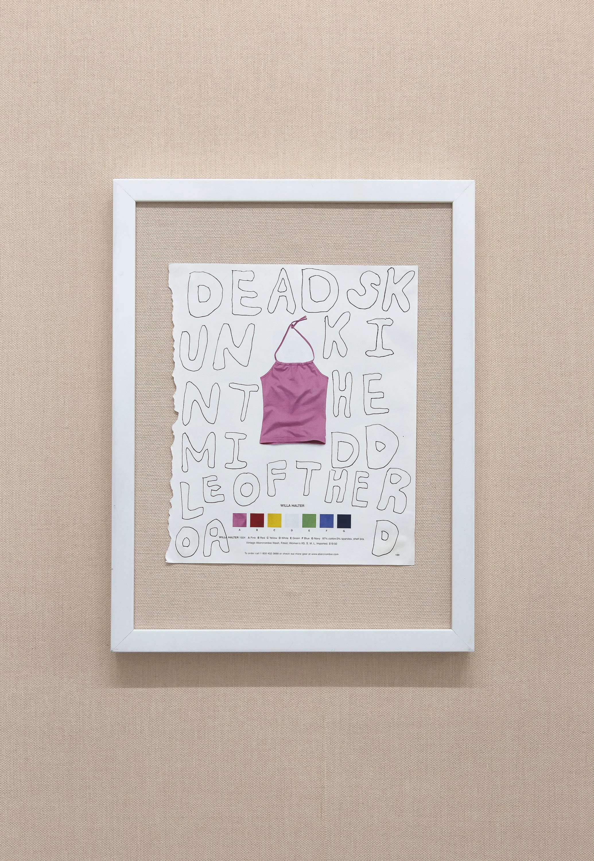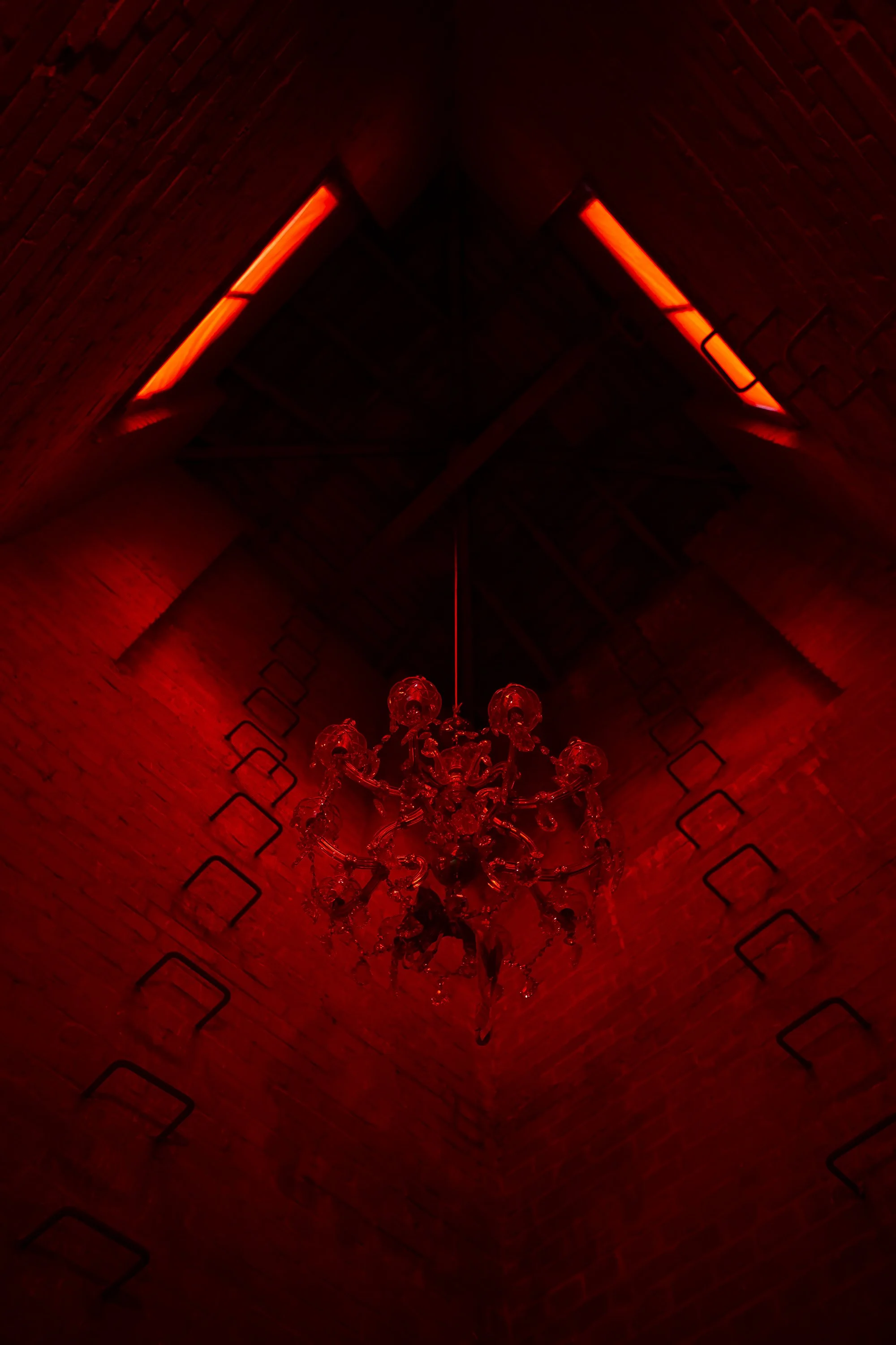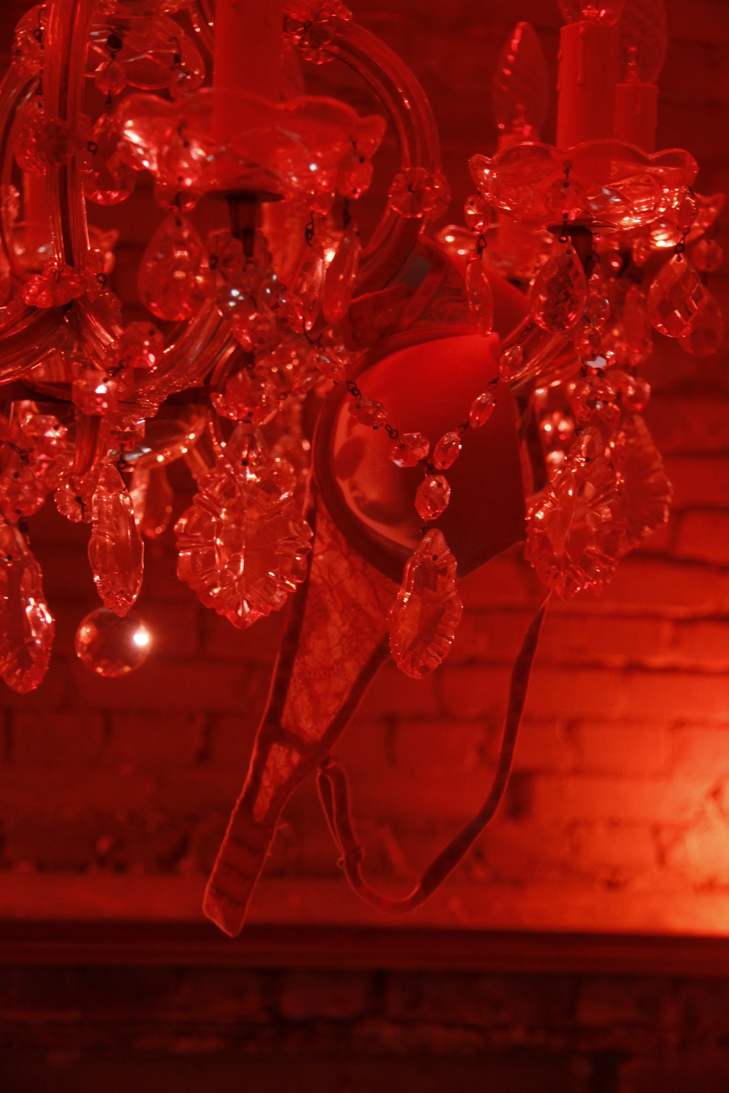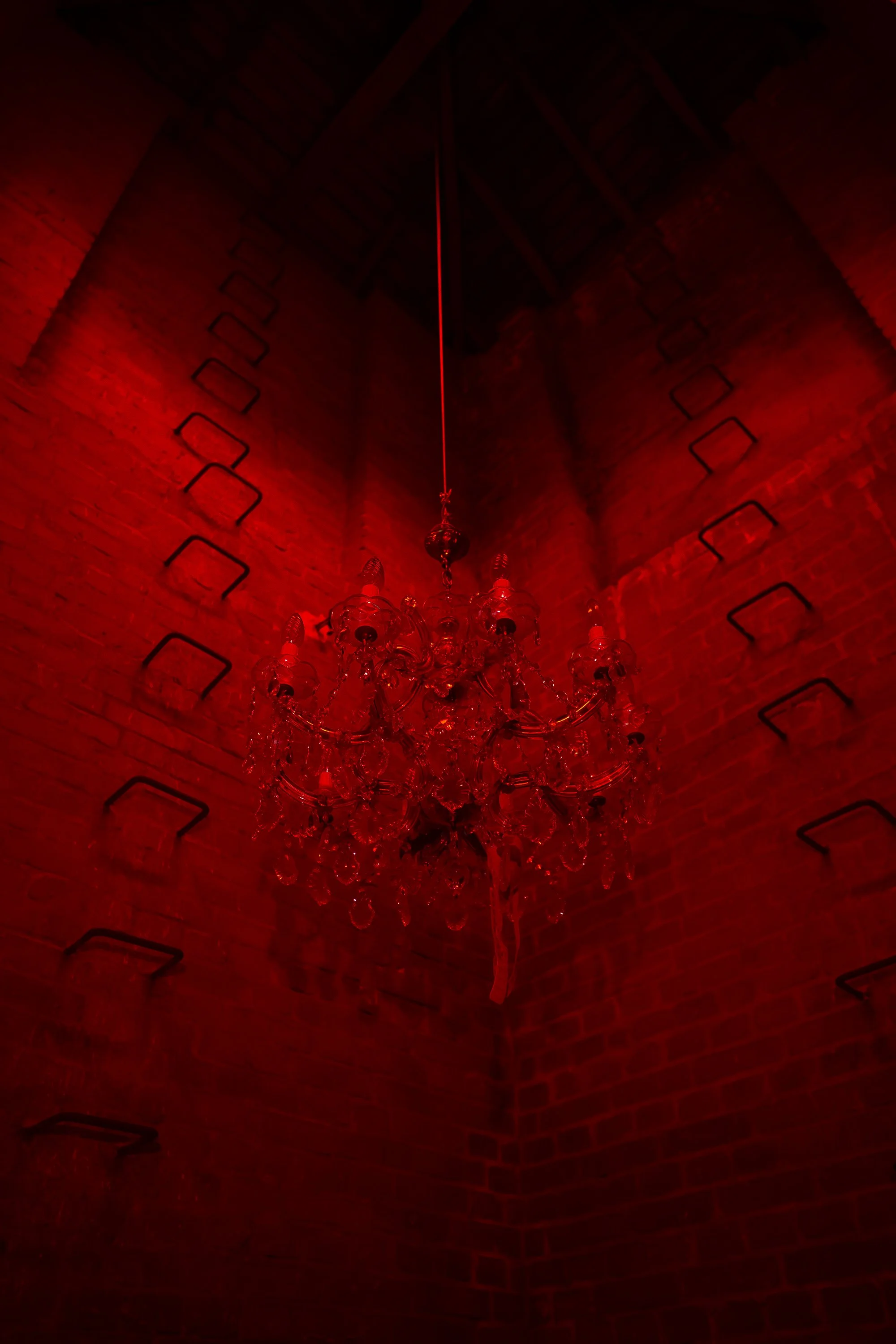In this new series, Clarken adds nostalgic texts to a collection of Abercrombie & Fitch advertisements. The texts are a combination of personal anecdotes, and excerpts from The O.C., Laguna Beach, and The Hills that leaves viewers unable to identify real from fiction. In “Centerfold”, Clarken blurs fiction with memory again by appropriating a catalogue image for Abercrombie & Fitch, stretched across a bed , in the aftermath of a pillow fight. Two Truths and a Lie continues with an installation that transforms the tower into a throat, the red light closing in on itself as you near it’s glimmering centrepiece that’s soon to be what forces you back out.