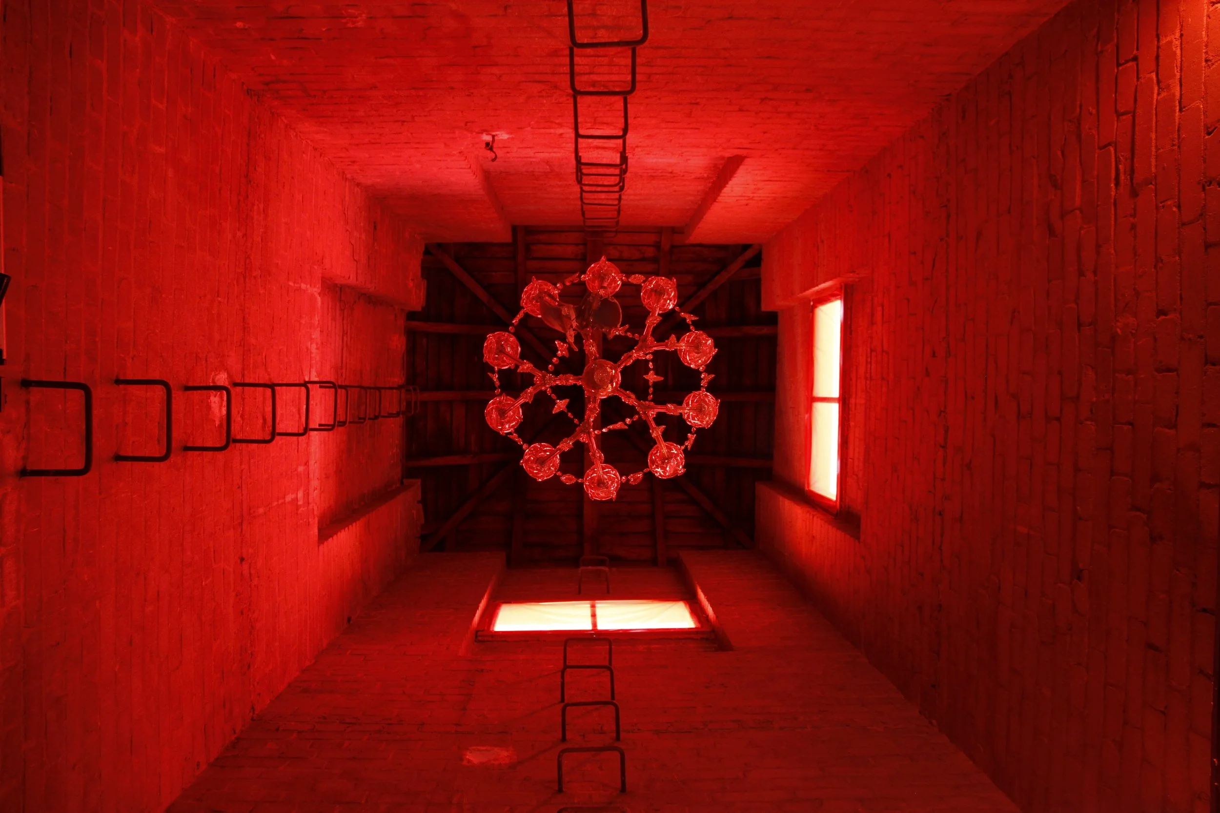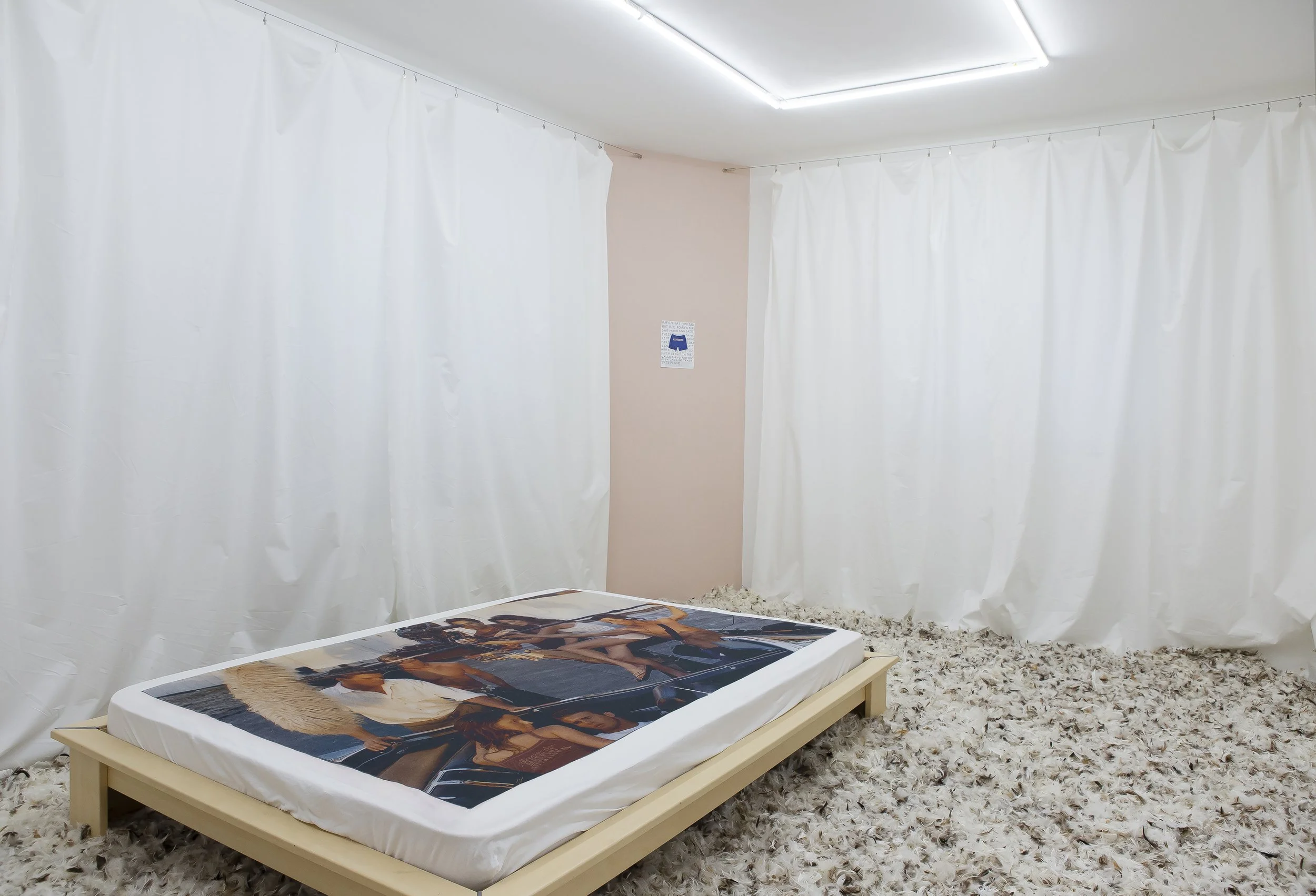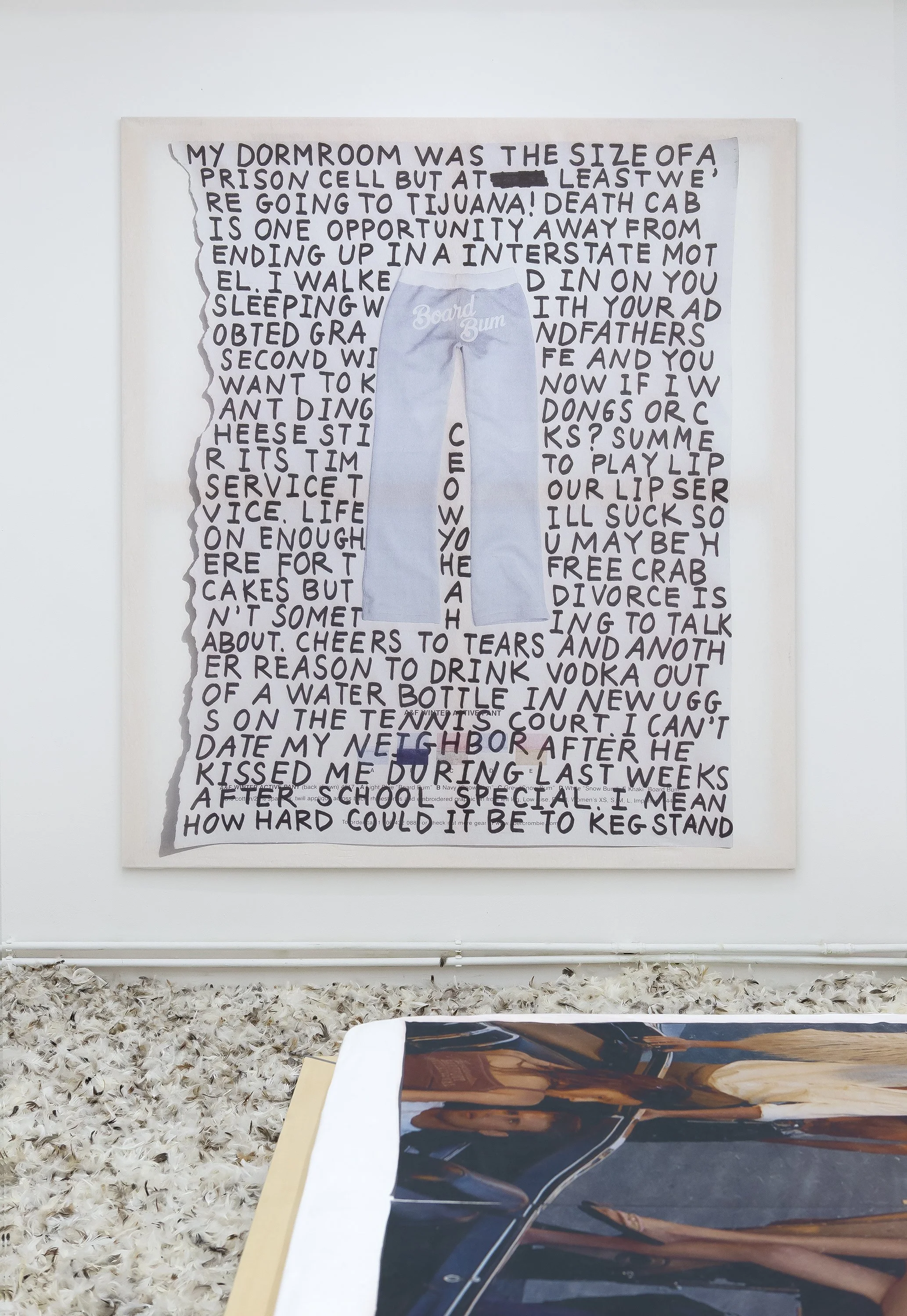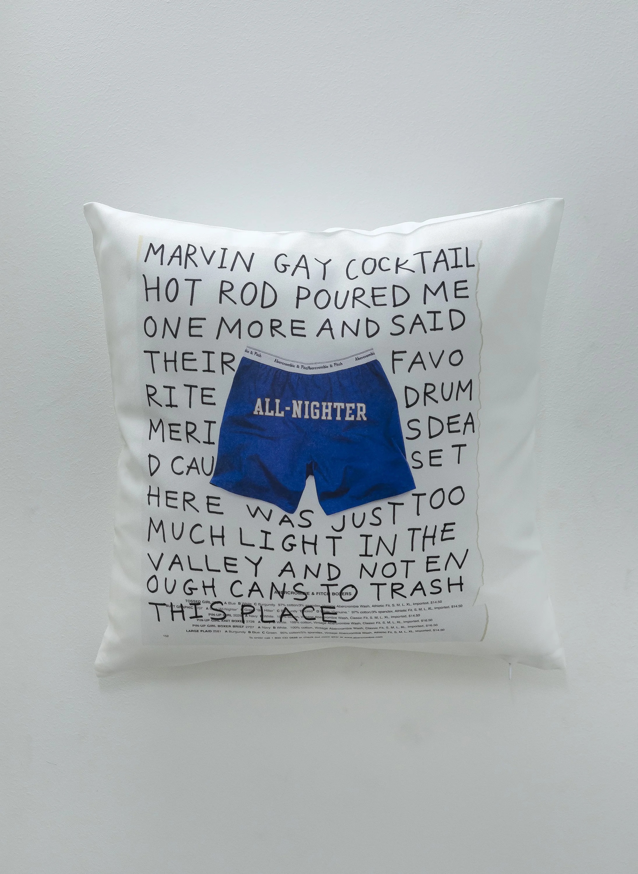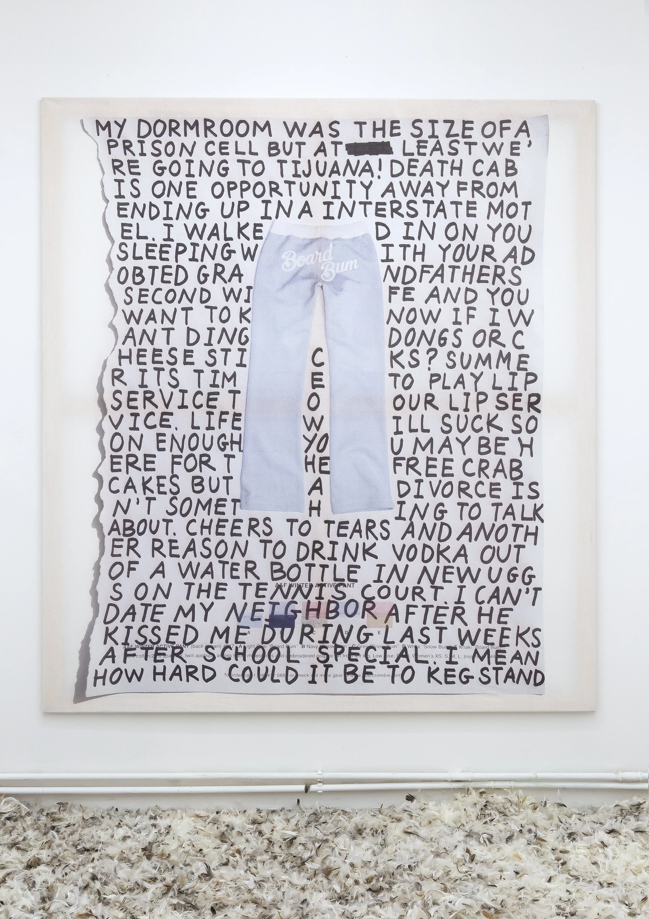 In this new series, Clarken adds nostalgic texts to a collection of Abercrombie & Fitch advertisements. The texts are a combination of personal anecdotes, and excerpts from The O.C., Laguna Beach, and The Hills that leaves viewers unable to identify real from fiction. In “Centerfold”, Clarken blurs fiction with memory again by appropriating a catalogue image for Abercrombie & Fitch, stretched across a bed , in the aftermath of a pillow fight. Two Truths and a Lie continues with an installation that transforms the tower into a throat, the red light closing in on itself as you near it’s glimmering centrepiece that’s soon to be what forces you back out.